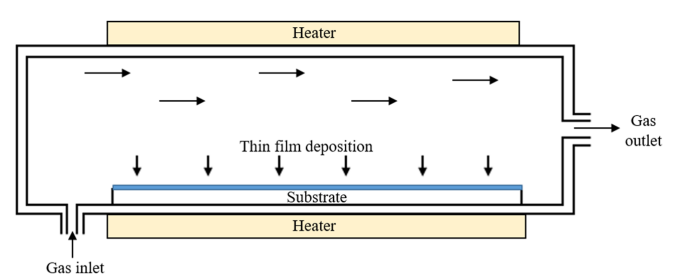 1. Οι πρόδρομες ουσίες της αντίδρασης παρέχονται στον θάλαμο αντίδρασης με ένα φέρον αέριο. Πριν φτάσουν στο υπόστρωμα, τα αέρια της αντίδρασης μπορεί να υποστούν ομοιογενείς αντιδράσεις αέριας φάσης στην κύρια ροή αερίου, δημιουργώντας ορισμένα ενδιάμεσα προϊόντα και συστάδες.