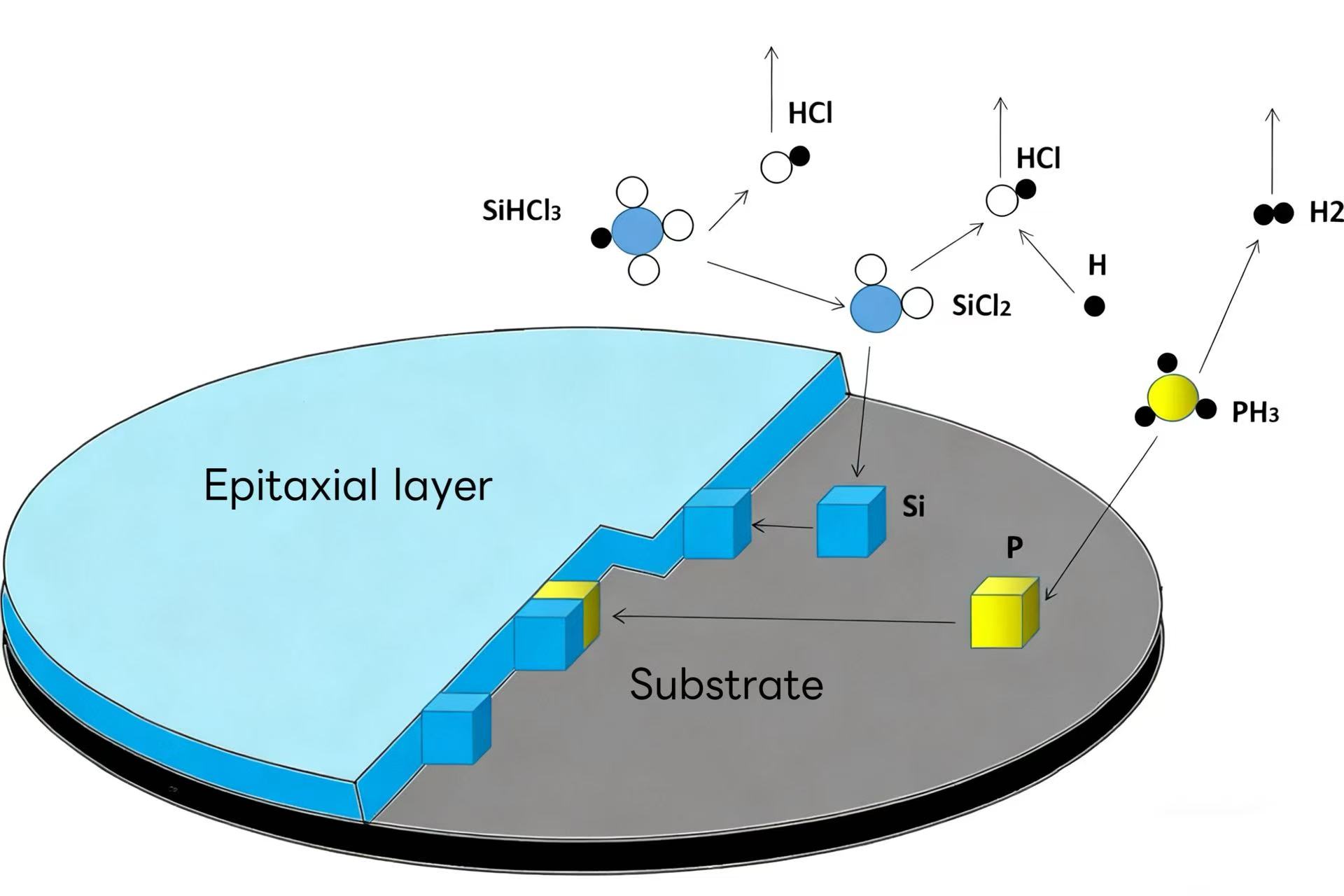 Η επιταξία πυριτίου γενικά χρησιμοποιεί έναν κλίβανο επιταξίας σε φάση ατμού. Η αρχή της είναι ότι η αποσύνθεση πηγής πυριτίου (όπως σιλάνιο, διχλωροσιλάνιο, τριχλωροσιλάνιο και τετραχλωριούχο πυρίτιο αντιδρά με υδρογόνο για να δημιουργήσει πυρίτιο. Κατά τη διάρκεια της ανάπτυξης, αέρια ντόπινγκ όπως PH3 και B2H6 μπορούν να εισαχθούν ταυτόχρονα. Η συγκέντρωση ντόπινγκ ελέγχεται με ακρίβεια με μια ειδική συγκέντρωση αερίου με μερική πίεση αντίσταση.